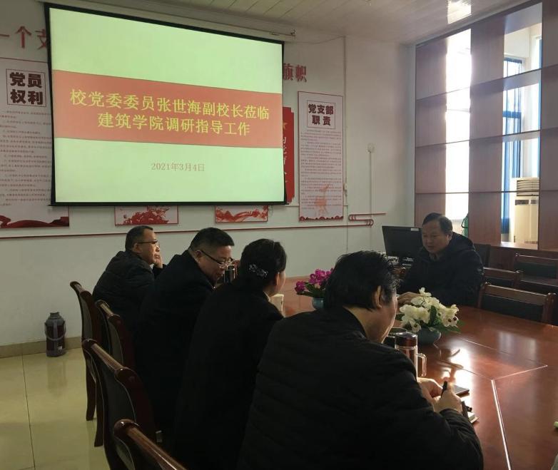 张世海副校长认真听取汇报并提出指导意见。他强调,一是要着重抓好课程思政,将其作为献礼建党100周年的重要工作,要结合学院发展和教学科研实际,结合党史学习教育,带领每个基层支部、教研室明确在立德树人、课程思政方面的责任,积极创造标志性的成果;二是要高度重视学院的师资队伍建设,从而推动学科专业建设,没有高质量的教师队伍,就没有高水平的专业,就培养不出高质量的学生,做不出高质量的科研成果;三是要依托学校“十四五”规划的具体方案,结合专业特色抓重点创亮点,以产学融合为抓手,充分发挥跨学科交叉融合的优势,扎根南阳,服务南阳。