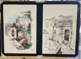 本次展出的作品是由2022级环境设计专业127名学生在安徽宏村及周边景区写生绘画完成,环境设计教研室吴相凯、关雪菲、王忞、王小飞、马翠霞老师担任指导。同学们在实地调研的基础上,通过对徽派建筑进行写生绘画,对建筑结构与形式有了更加深入的理解。