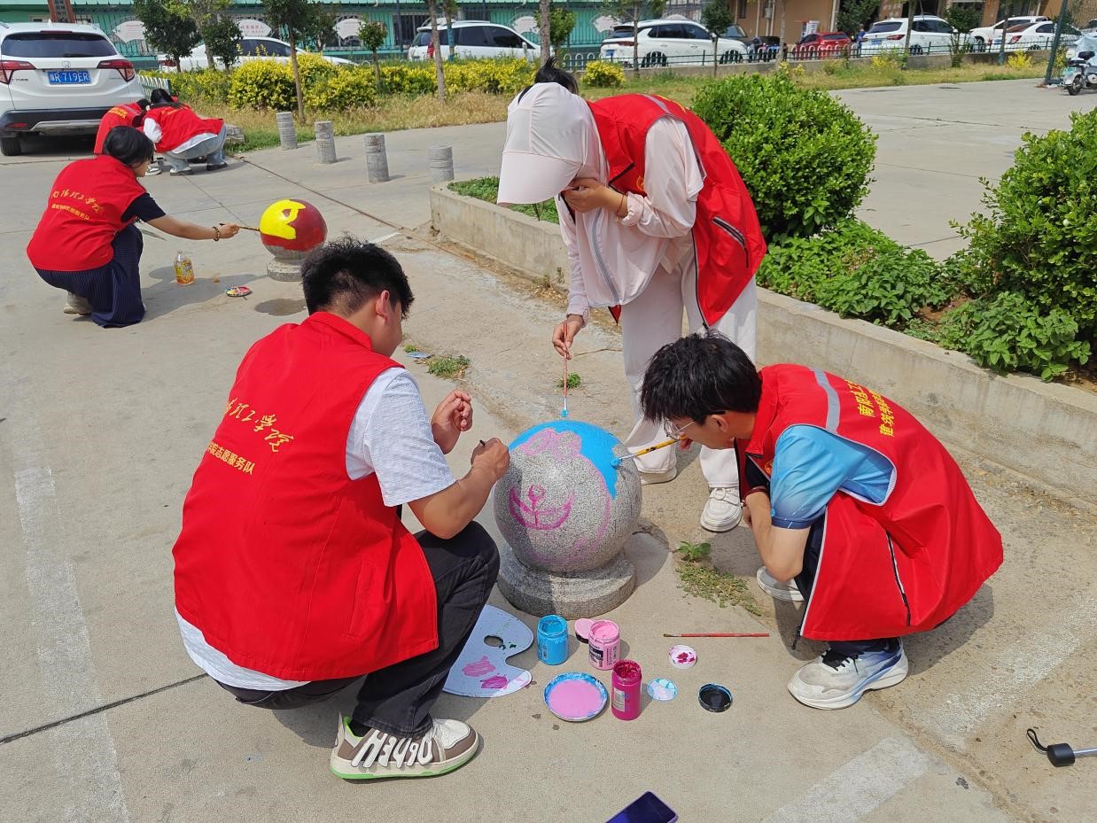 活动中,我院学生有序领取绘画工具,每组三人,充分发挥想象力,大胆构图,细致勾勒,在石墩上尽情作画,用明快鲜艳的色彩搭配赋予石墩靓丽的外表。