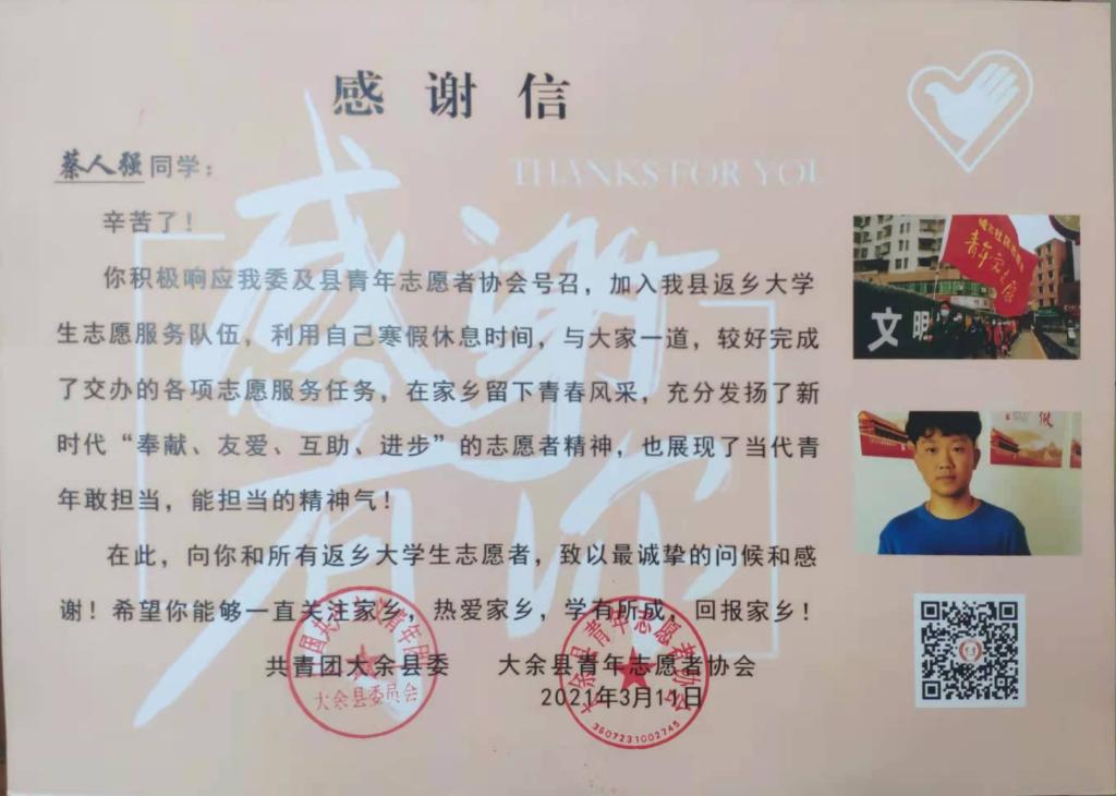 2021年3月,一封感谢信寄到了校团委,落款为共青团大余县委员会和大余县青年志愿者协会。信中对必赢76net线路蔡人强同学寒假期间的志愿服务工作进行了表彰,并对我校团委的栽培表达了敬意和感谢。