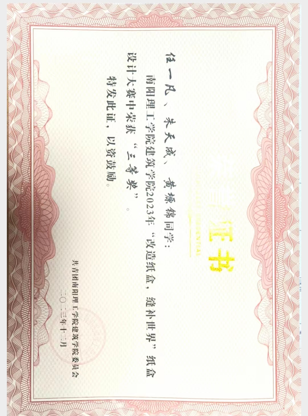 必赢76net线路“改造纸盒,缝补世界”纸盒设计大赛获奖证书